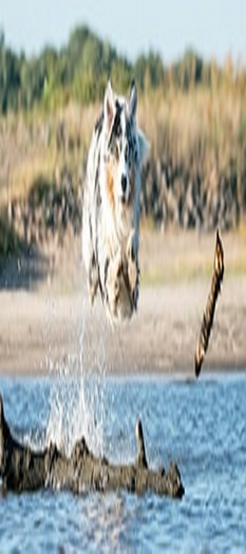Ein weißer Hund steht auf einem Holzstamm vor einem türkisblauen Bergsee, umgeben von grünen Bäumen und felsigen Bergen im Hintergrund. Ein weißer Hund steht auf einem Holzstamm vor einem türkisblauen Bergsee, umgeben von grünen Bäumen und felsigen Bergen im Hintergrund.